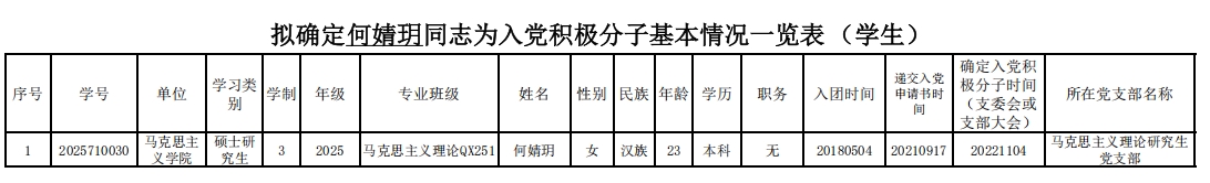 经对新生档案材料审查,认定何婧玥同学在本科阶段的入党积极分子材料齐全、程序规范。经支部委员会会议讨论决定并报马克思主义学院党委备案,确定何婧玥同学为入党积极分子,现予以公示。