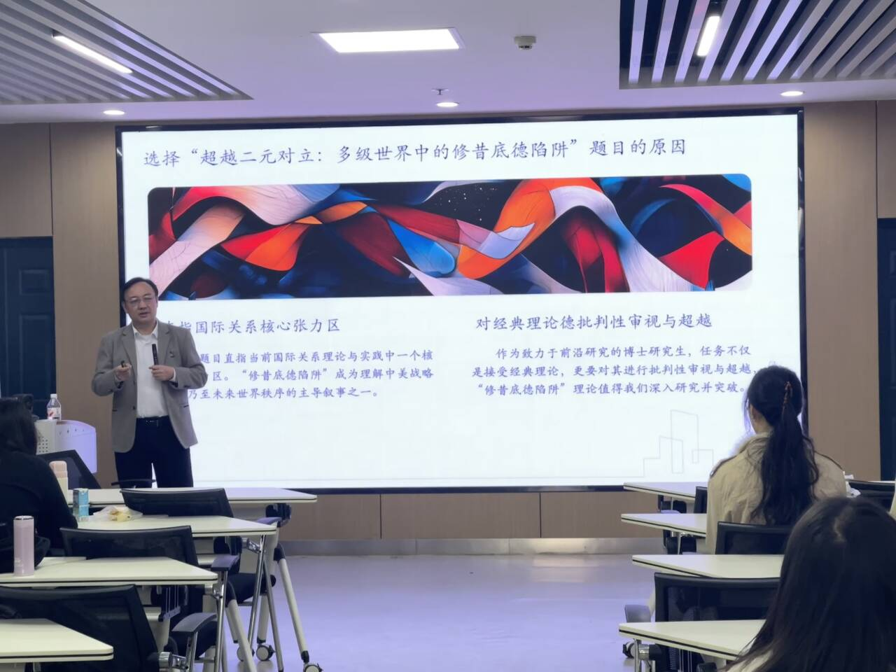 (通讯员 曹君萍 何知知)11月12日11时,长江大学马克思主义学院求实导师学术沙龙在文科大楼1008室举行。本期沙龙特邀马克思主义学院何章银教授作题为“超越二元对立:多级世界中的‘修昔底德陷阱’”的报告,40余名研究生到场参与。