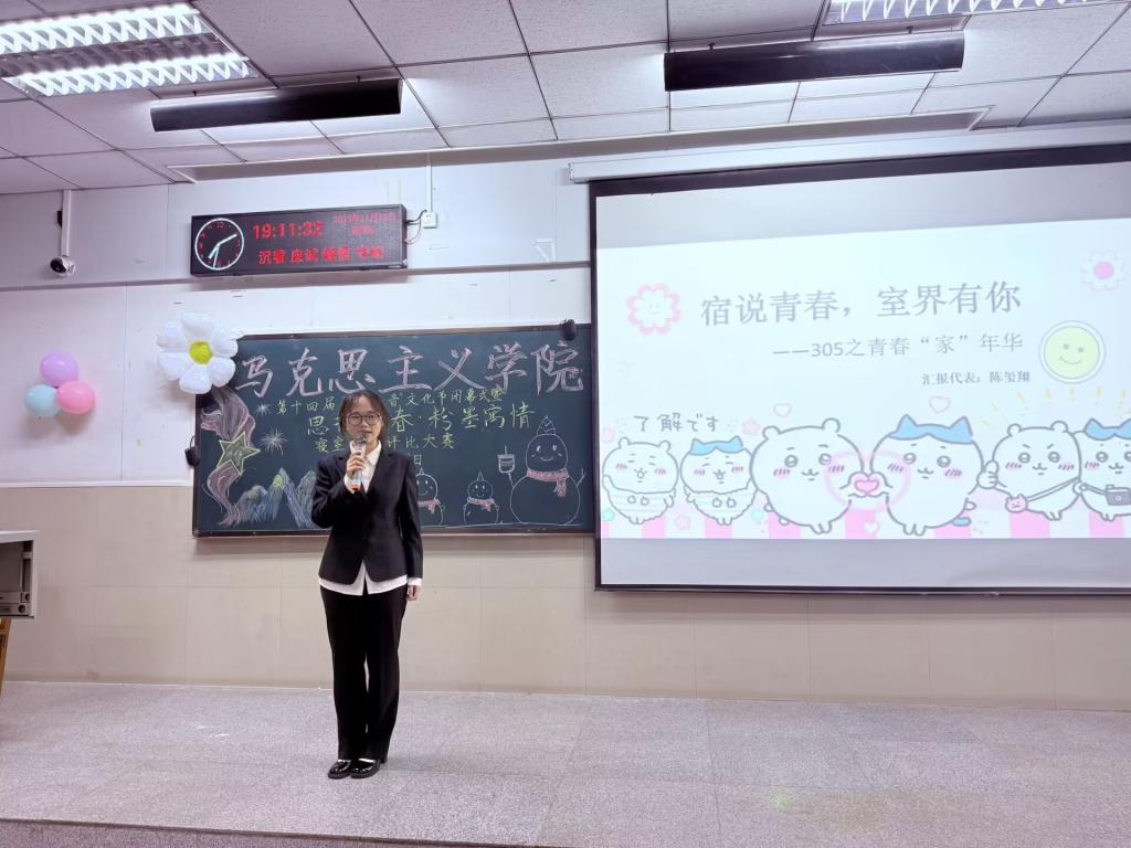 (通讯员 柳佳敏/文 丁靖易 李欣怡 夏宇靓/摄)11月28日晚,马克思主义学院寝室文化评比大赛暨第十四届“思政之音”文化节闭幕式在12教204室举行。学工办主任张云雾、辅导员邓鹏以及学生会主席团成员担任评委,研究生与本科生共十个寝室同台展示风采,部分学生干部及全体大一新生与会观摩。