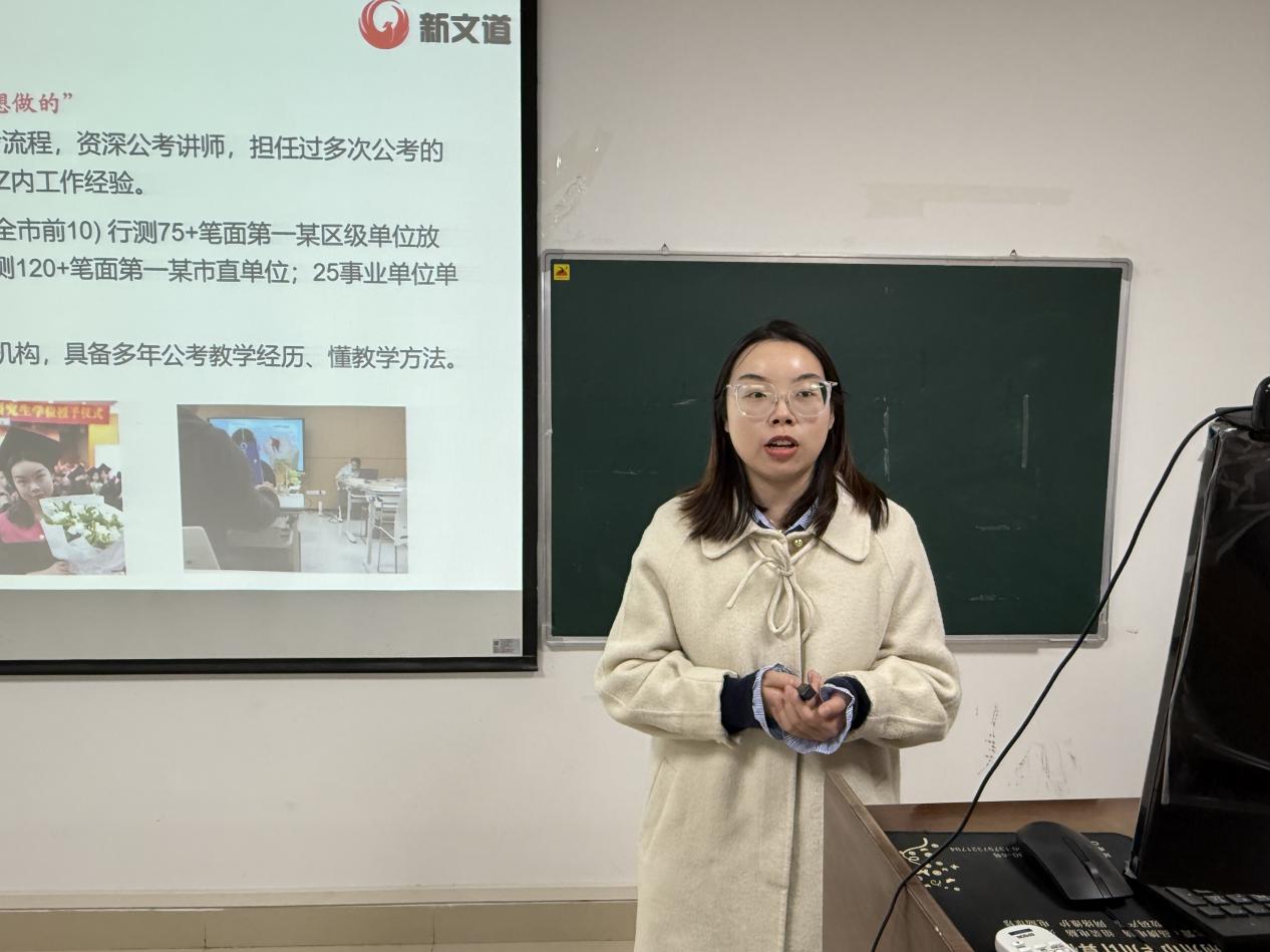 (通讯员 汤羽彤/文 刘诗雨/摄)为助力研究生精准把握人才引进相关政策,持续强化学院人才队伍建设,切实服务学生就业发展需求,12月25日晚7点,马克思主义学院于文科楼1104教室隆重举办人才引进专项政策解读暨复习规划讲座。本次讲座特邀荆州新文道教育资深讲师陈雅倩老师主讲,学院辅导员邓鹏老师及50余名研究生共同参与。