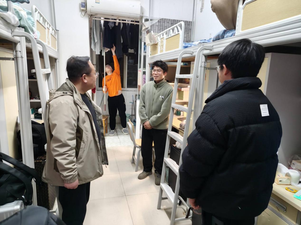 (通讯员 童亮 刘家豪)3月1日晚8时,马克思主义学院竺正海副书记、学工办主任张云雾老师、辅导员邓鹏老师深入学院本科及研究生宿舍开展查寝走访工作,重点排查宿舍安全隐患,细致了解学生生活近况,切实传递学院对学生的关怀与重视。 走访过程中,老师们逐一检查各宿舍的用电安全、卫生环境及物品摆放情况,重点排查违规电器、私拉电线等潜在安全风险,现场提醒同学们严格遵守宿舍管理相关规定,进一步增强安全防范意识,自觉养成良好的宿舍生活习惯。