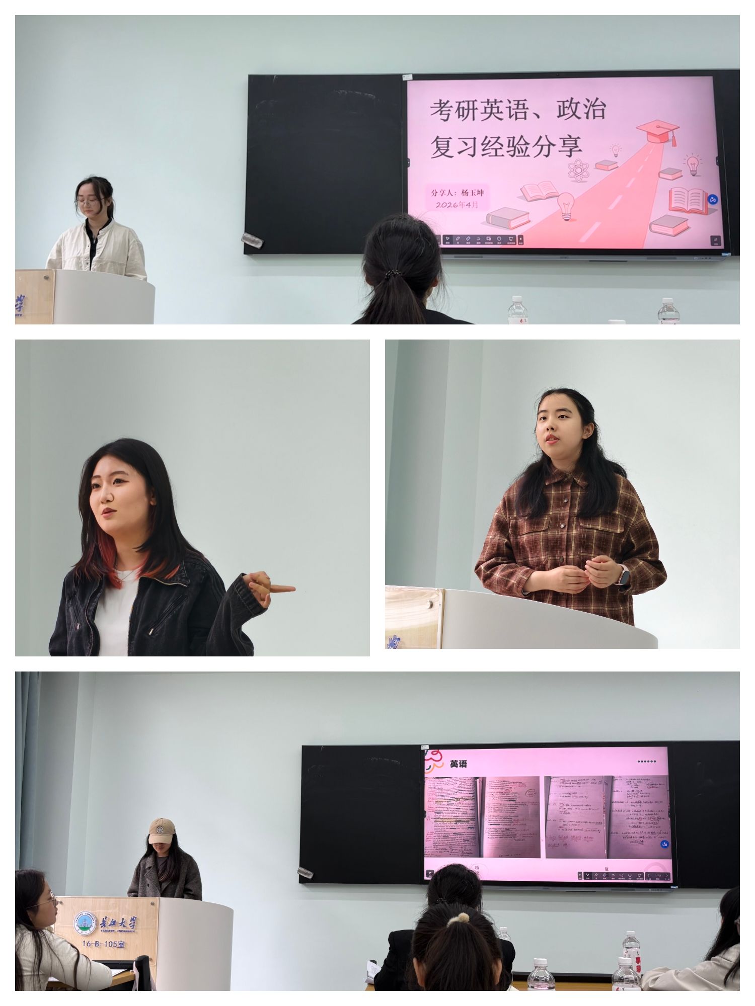 (通讯员 彭振午/文 夏宇靓/摄)为帮助2027届毕业生明确考研方向、掌握科学备考方法、坚定升学信心。4月14日下午,马克思主义学院在16教B105室举行2026届毕业生考研经验分享会。活动由学工办主任张云雾主持,温雪婷等考研优秀学生代表分享了备考经验,2023级全体本科生参会。
