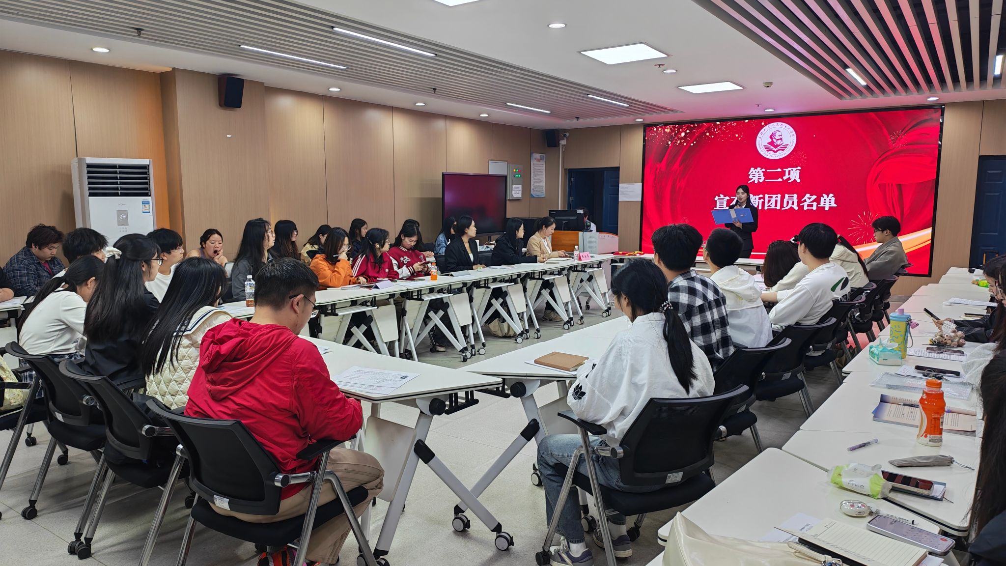 仪式在雄壮的国歌声中拉开帷幕,主持人宣读了刘沁等5名新发展团员名单。张云雾老师为新团员颁发团员证、佩戴团徽。随后,新团员们在团组织负责人的带领下面向团旗庄严宣誓,铿锵誓言响彻会场,也让在场的优秀团员代表重温了入团初心。新团员代表曹曾云、优秀团员代表王梦圆依次发言,分享成长感悟与青春担当,表达了践行团员使命、勇担时代责任的决心。